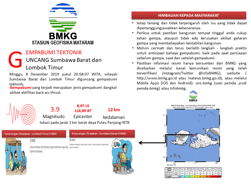 AmpenanNews. Kejadian dan Parameter Gempabumi pada hari Minggu, 08 Desember 2019 pukul 20:58:07 WITA, wilayah Sumbawa Barat dan Lombok Timur diguncang gempabumi tektonik. Hasil analisa BMKG menujukkan bahwa gempabumi ini berkekuatan M=3,9. Episenter terletak pada koordinat 8,47 LS dan 116,89 BT, atau tepatnya berlokasi di laut pada jarak 3 km barat daya Pulaupanjang, Nusa Tenggara Barat pada kedalaman 12 km.