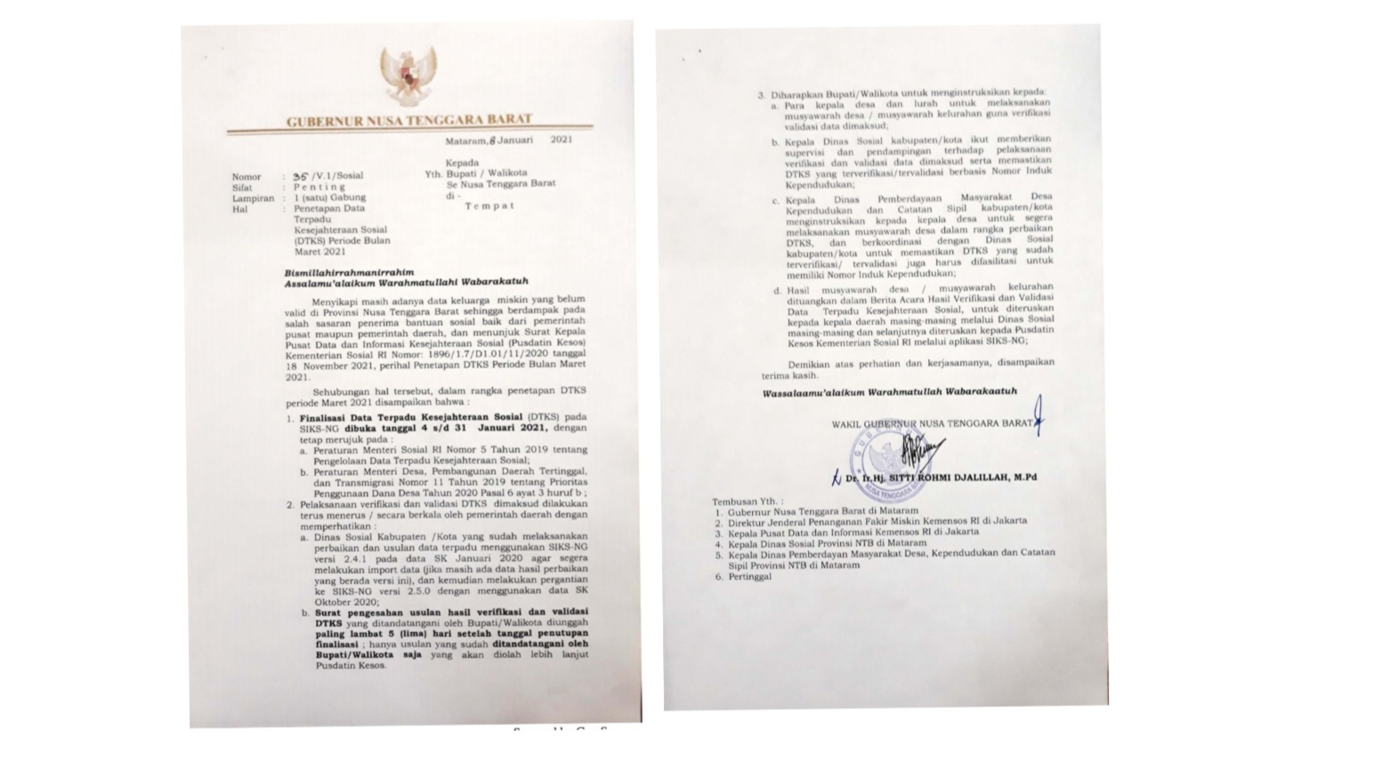 Wakil Gubernur NTB, Dr. Ir. Hj. Sitti Rohmi Djalilah, M.Pd menegaskan telah melayangkan surat resmi yang ditujukan kepada Bupati/Walikota se Provinsi NTB, dengan nomor 35/V.1/Sosial tanggal 8 Januari 2021. Mengenai penetapan DTKS periode Maret 2021. Poin yang disampaikan antaranya, bahwa Finalisasi Data Terpadu Kesejahteraan Sosial (DTKS) pada SIKS-NG dibuka tanggal 4 s/d 31 Januari 2021, dengan tetap merujuk pada Peraturan Menteri Sosial RI Nomor 5 Tahun 2019 tentang Pengelolaan Data Terpadu Kesejahteraan Sosial.