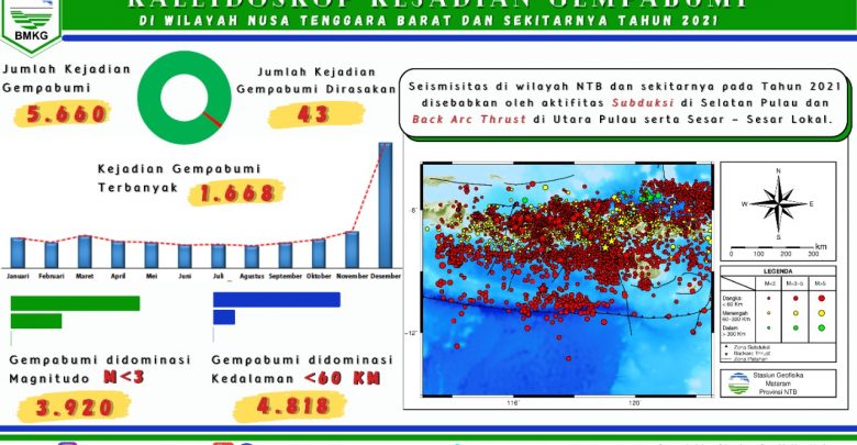 AmpenanNews. Seismisitas di wilayah NTB dan sekitarnya yg tercatat dan teranalisa oleh Stasiun Geofisika Mataram selama Tahun 2021 telah terjadi gempabumi sebanyak 5660 kejadian yg didominasi oleh kejadian dengan Magnitudo <3.0 dan kedalaman dangkal <60 Km. Dari 5660 kejadian tsb terdapat 43 kejadian gempabumi yg dirasakan sekitar wilayah NTB.