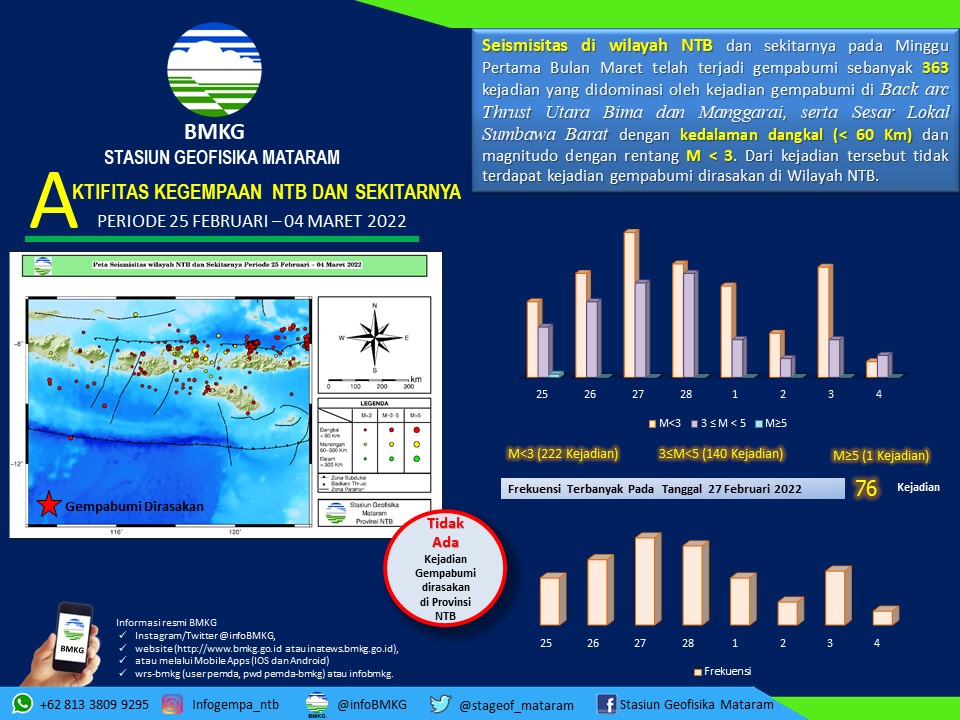 AmpenanNews. Gelaran MotoGP sebantar lagi, sedangkan seismisitas di wilayah NTB dan sekitarnya yang tercatat dan teranalisa oleh Stasiun Geofisika Mataram pada Minggu Pertama Periode 25 Februari – 04 Maret 2022, telah terjadi gempabumi sebanyak 363 kejadian yang didominasi oleh kejadian dengan Magnitudo <3.0 dan kedalaman dangkal <60 Km.